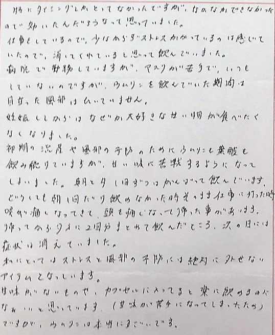 特にタイミングしかとってなかったんですが、なかなかできなかったので効いたんだろうなって思っていました。仕事をしているので、少なからずストレスがかかっているのは感じていたので、消してくれていると思って飲んでいました。妊娠してからはなぜか大好きな甘い物が食べたくなくなりました。朝と夕1回ずつはがんばって飲んでいます。どうしても朝1回あけ飲めなかった時、そのまま仕事に行った時喉が痛くなってきて、頭も痛くなって帰ったことがあります。帰ってから夕方に2回分まとめて飲んだところ、次の日には症状は消えていました。甘味がないものや、カプセルに入っていると楽に飲めるのになあ…と思っています。(甘味が苦手になってしまったため)ですが、ウムリンは本当にすごいです。