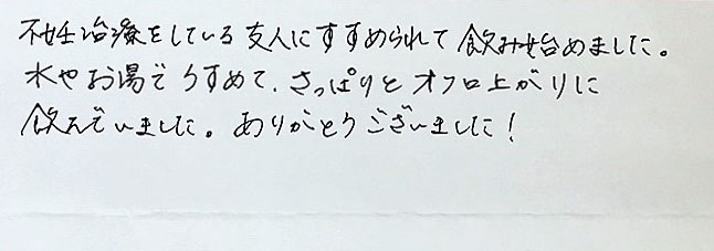 不妊治療をしている友人にすすめられて飲み始めました。水やお湯でうすめて、さっぱりとオフロ上がりに飲んでいました。ありがとうございました!