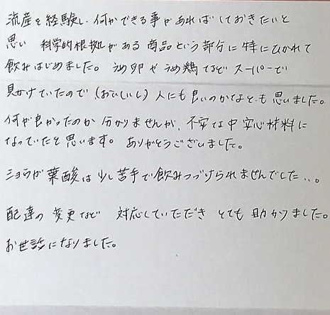 流産を経験し、何かできる事があればしておきたいと思い、科学的根拠がある商品という部分に特にひかれて飲みはじめました。うめ卵やうめ鶏などスーパーで見かけていたので(おいしいし)人にも良いのかなとも思いました。何が良かったのか分かりませんが、不安な中安心材料になっていたと思います。ありがとうございました。ショウガ葉酸は少し苦手で飲み続けられませんでした‥。配達の変更など対応していただきとても助かりました。お世話になりました。