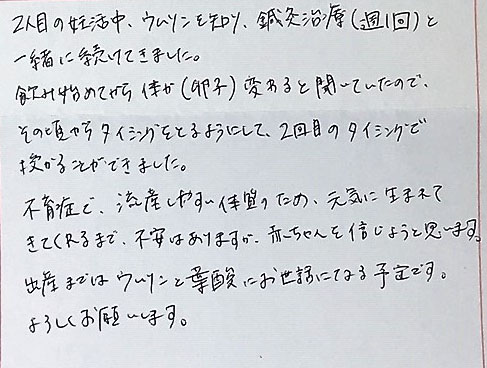 2人目の妊活中、ウムリンを知り、鍼灸治療(週1回)と一緒に続けてきました。不育症で、流産しやすい体質のため、元気に生まれてきてくれるまで、不安はありますが、赤ちゃんを信じようと思います。出産まではウムリンと葉酸にお世話になる予定です。よろしくお願いします。