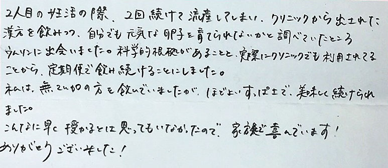 2人目の妊活の際、2回続けて流産してしまい、クリニックから出された漢方を飲みつつ、自分でも元気な卵を育てられないかと調べていたところ、ウムリンに出会いました。科学的根拠があることと、実際にクリニックでも利用されていることから、定期便で飲み続けることにしました。私は、無てん加の方を飲んでいましたが、ほどよいすっぱさで、美味しく続けられました。ありがとうございました!