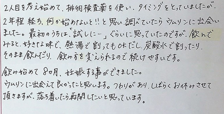 2人目を考え始めて、排卵検査薬を使い、タイミングを取っていましたが、2年ほど経ち、何か始めないと!!と思い調べていたらウムリンに出会いました。最初のうちは「試しに…」ぐらいに思っていたのですが、飲んでみると好きな味で、熱湯で割ってもOKだし、炭酸水で割ったり、そのまま飲んだり、飲み方を変えられるので続けやすいです。ウムリンに出会えて良かったと思います。つわりがあり、しばらくお休みさせて頂きますが、落ち着いたら再開したいと思っています。