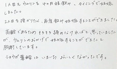 1人目 タイミングで妊娠しました。2人目を授かりたい。高齢であるためそろそろ諦めなければと思っていました。感謝しています。ショウガ葉酸はいまいちおいしくなかったです。