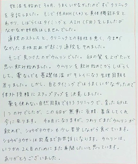 妊活を始めて3ヶ月、うまくいかなかったのですぐにクリニックを受診しました。しばらくはタイミングとAIH(5回)をしましたがなかなか妊娠はしませんでした。通院のストレスと、クリニックの相性も悪く通院をやめました。自己タイミングでうまくいかなかったので体外受精にステップアップを決意しました。4ヶ月になりますが、つわりでまだウムリンが飲めず、ショウガヨウサンも少し苦労しながら食べています。ありがとうございました。