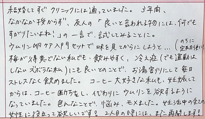 結婚してすぐクリニックには通っていました。3年間、なかなか授からず。ウムリン卵ケア入門セットで味を見てからにしようと…。梅が得意でない私でも、飲みやすく、お湯割りにして毎日ストレスなく飲めました。コーヒー大好きな私も、妊娠してからはコーヒー断ちをし、代わりにウムリンを飲むようにしていました。いろんなことで悩みモメました。妊活中のすべての女性に役立って欲しいです!