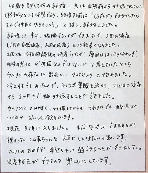 40歳を越えてからの結婚、夫は交際前から妊娠させにくい(精子が少ない)体質であり、結婚する前は「(子どもが)できなかったら2人で仲良く生きていこう」と話し、結婚しました。結婚して半年、2回の流産(1回自然流産、2回目死産)という結果となりました。2回とも心拍確認後の流産でしたが、原因ははっきりと分からず。2回目の流産から3ヶ月半で妊娠することができました。ウムリンはのみやすく酸味がいいのかおいしく飲めています。現在4ヶ月に入りました。まだ安心はできませんが、授かったこの赤ちゃんを大事にしていきたいと思います。出産報告ができるのを楽しみにしています。