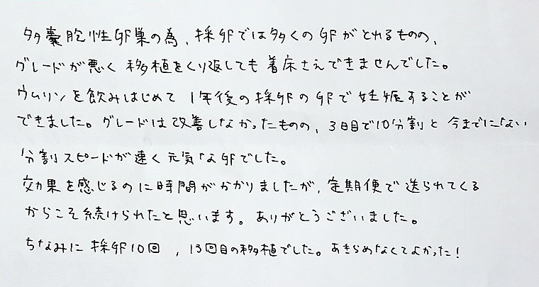 多嚢胞性卵巣の為、採卵では多くの卵が採れるものの、グレードが悪く移植を繰り返しても着床さえできませんでした。定期便で送られてくるからこそ続けられたと思います。ありがとうございました。ちなみに採卵10回、13回目の移植でした。あきらめなくてよかった!