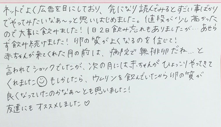 値段が少し高かったので大事に飲みました!1日2日飲み忘れもありましたが、あせらず飲み続けました!病院で無排卵だね…と言われてショックでしたが、次の月にはひょっこりやってきてくれました(*^_^*)友達にもオススメしました♡