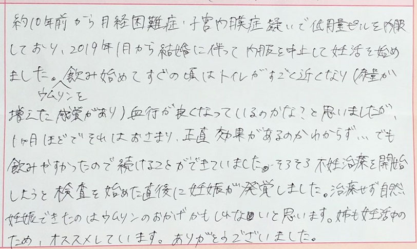 約10年前から月経困難症・子宮内膜症疑いで低用量ピルを内服しており、2019年1月から結婚に伴って内服を中止して妊活を始めました。そろそろ不妊治療を開始しようと検査を始めた直後に治療せず自然に出来ました。ありがとうございました。