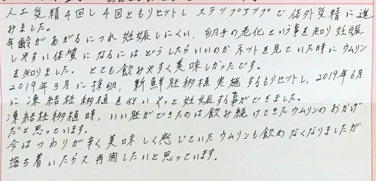 年齢があがるにつれできにくいという事を知りできやすい体質になるにはどうしたらいいのかネットを見ていました。ウムリンはとても飲みやすく美味しかったです。今はつわりが辛く美味しく感じていたウムリンも飲めなくなりましたが、落ち着いたら又再開したいと思っています。