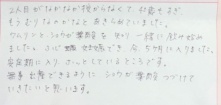 2人目がなかなか授からなくて、40歳もすぎ、もうむりなのかなとあきらめていました。安定期に入りホッとしているところです。