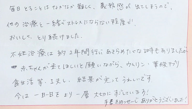 不妊治療は約2年間行い諦めたくなる時もありましたが食事等工夫し、結果が実って嬉しいです。今は一日一日をより一層大切にすごしています!