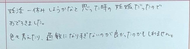 妊活一休みしようかなと思った時にできたので、おどろきました。色々考えたり、過敏になりすぎないのが良かったのかもしれません。