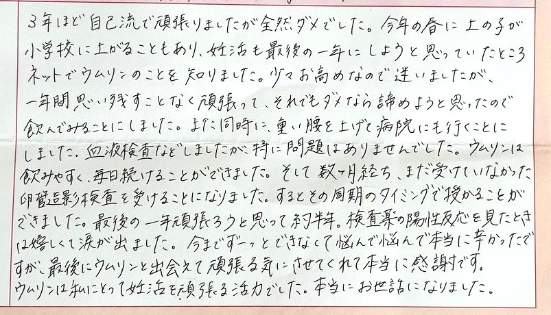 3年ほど自己流で頑張りましたが全然ダメでした。今年の春に上の子が小学校に上がることもあり、妊活も最後の一年にしようと思っていました。重い腰を上げて病院に行くことにしました。ウムリンは飲みやすく毎日続けることができました。本当にお世話になりました。