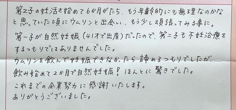 第2子の妊活を始めて6か月がたち、もう年齢的にも無理なのかなと思っていたけど、もう少し頑張ってみる事に。ありがとうございました。