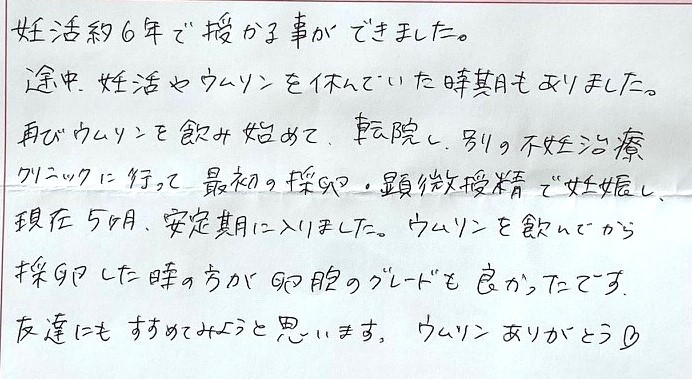 妊活約6年で成功しました。途中、妊活を休んでいた時期もありました。再び始めて転院し、別のクリニックに行ってできました。ありがとう♡