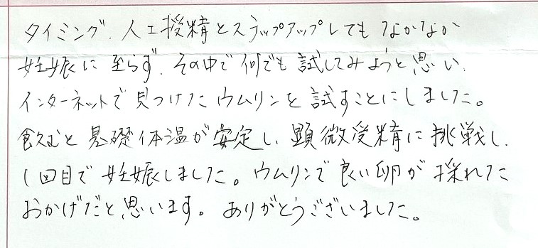 タイミング、人工授精とステップアップしてもなかなかできず、その中で何でも試してみようと思いました。ありがとうございました。