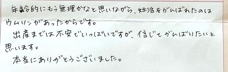 年齢的にもう無理かなと思いながら、妊活を頑張りました。本当にありがとうございました。