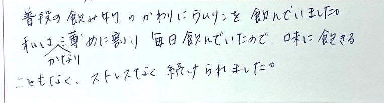 普段の飲み物のかわりにウムリンを飲んでいました。私はかなり薄めに割り毎日飲んでいたので、味に飽きることもなく、ストレスなく続けられました。
