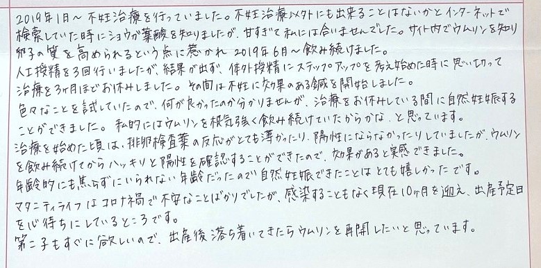 インターネットで検索していた時にショウガ葉酸を知りましたが、甘すぎて私には合いませんでした。サイト内でウムリンを知り、飲み続けました。年齢的にも焦らずにいられない年齢だったのでとても嬉しかったです。