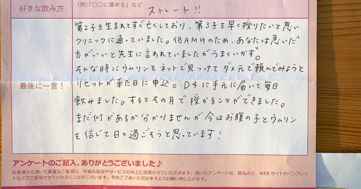 第3子を早く授かりたいと思い、クリニックに通っていました。まだ何があるか分かりませんが、信じて日々過ごそうと思います。