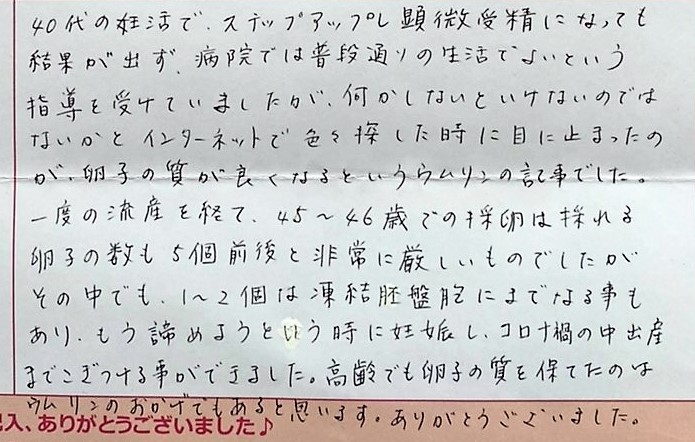もう諦めようという時に成功し、コロナ禍の中出産までこぎつける事ができました。ありがとうございました。