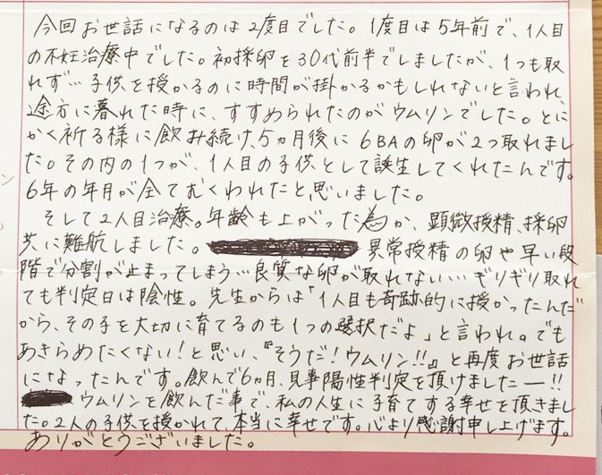 ウムリンを飲んだ事で、私の人生に子育てする幸せを頂きました。本当に幸せです。心より感謝申し上げます。ありがとうございました。