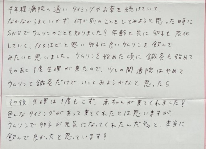 タイミングやお薬を続けていてなかなかうまくいかず、何か別のことをしてみようと思った時にSNSでウムリンのことを知りました!