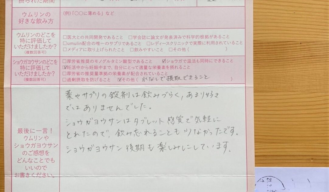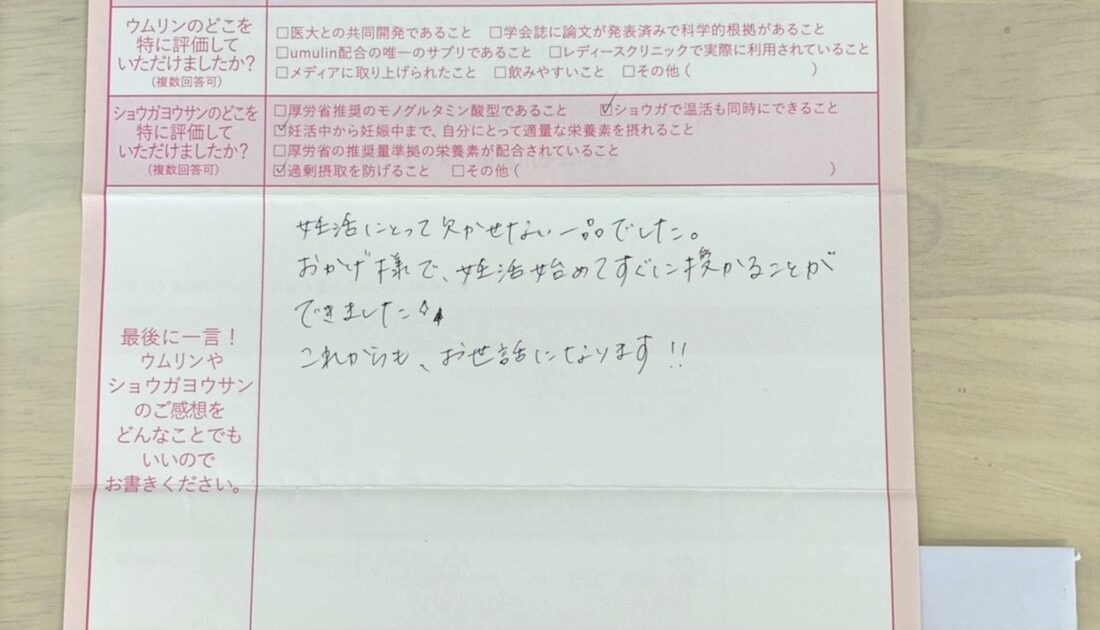 半年後位にウムリンのことを知りました。ウムリンは、年齢を気にしながら妊活されている方にとって、大きな支えになると思います。是非おすすめしたいです!ありがとうございました。