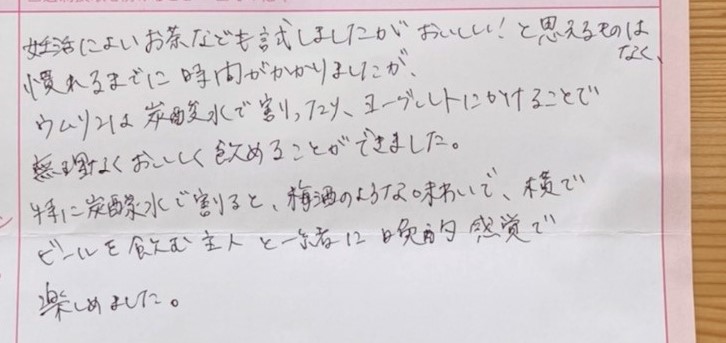 特に炭酸水で割ると、梅酒のような味わいで、横でビールを飲む主人と一緒に晩酌感覚で楽しめました。