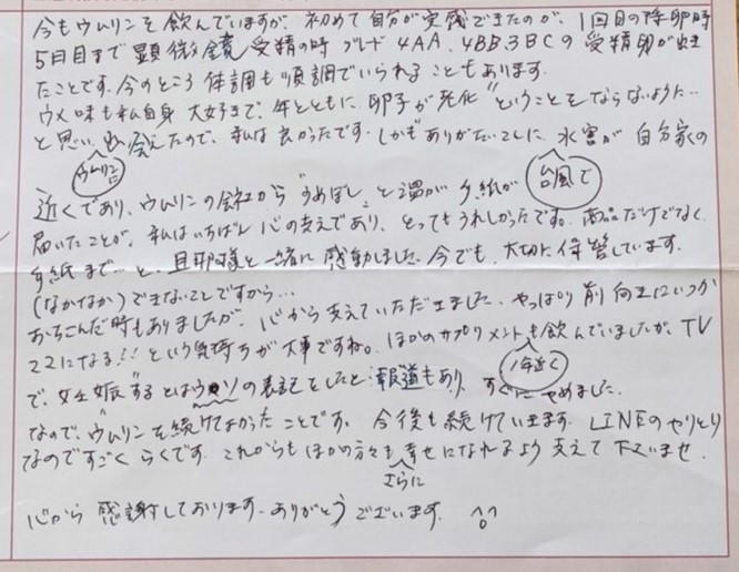 ウムリンに出会えたので、私は良かったです。しかもありがたいことに台風で水害が自分家の近くであり、ウムリンの会社から「うめぼし」と温かい手紙が届いたことが、私はいちばん心の支えであり、とってもうれしかったです。商品だけでなく、手紙まで…と旦那様と一緒に感動しました。今でも大切に保管しています。(なかなか)できないことですから…おち込んだ時もありましたが、心から支えていただきました。やっぱり前向きにいつかママになる!!という気持ちが大事ですね。