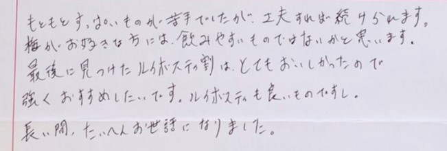 工夫すれば続けられます。梅がお好きな方には、飲みやすいものではないかと思います。最後に見つけたルイボスティ割りは、とてもおいしかったので強くおすすめしたいです。ルイボスティも良いものですし。