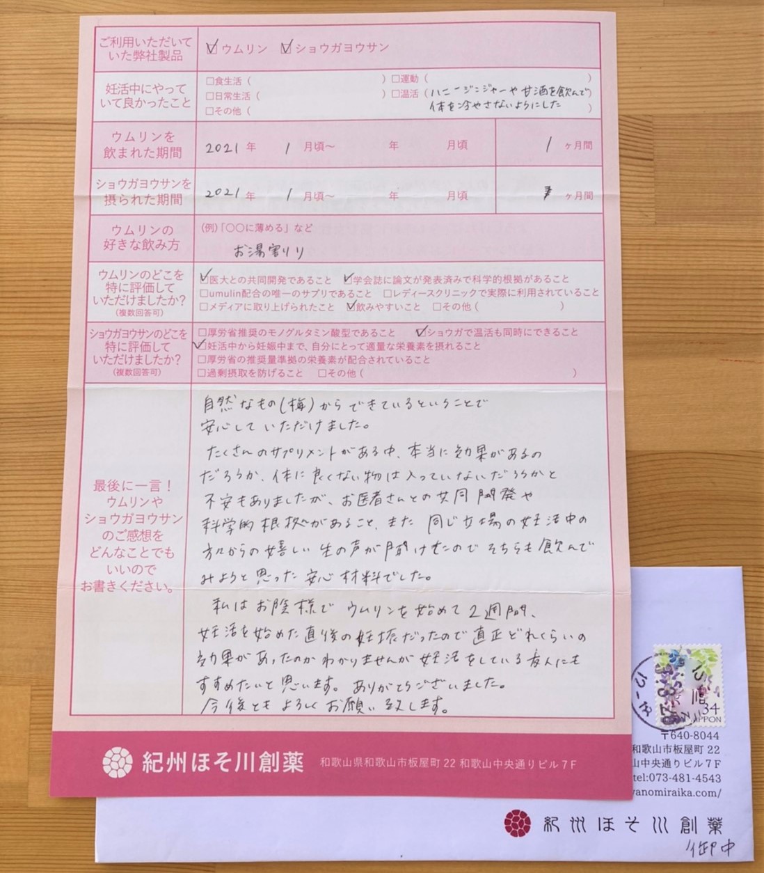 私はお陰様でウムリンを始めて2週間、妊活を始めた直後の妊娠だったので正直どれくらいの効果があったのかわかりませんが妊活をしている友人にもすすめたいと思います。ありがとうございました。