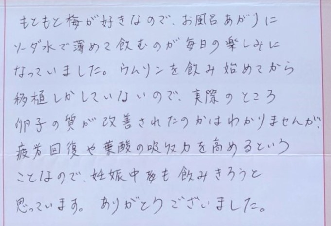 もともと梅が好きなので、お風呂あがりにソーダ水で薄めて飲むのが毎日の楽しみになっていました。疲労回復や葉酸の吸収力を高めるということなので、妊娠中も飲みろうと思っています。ありがとうございました。