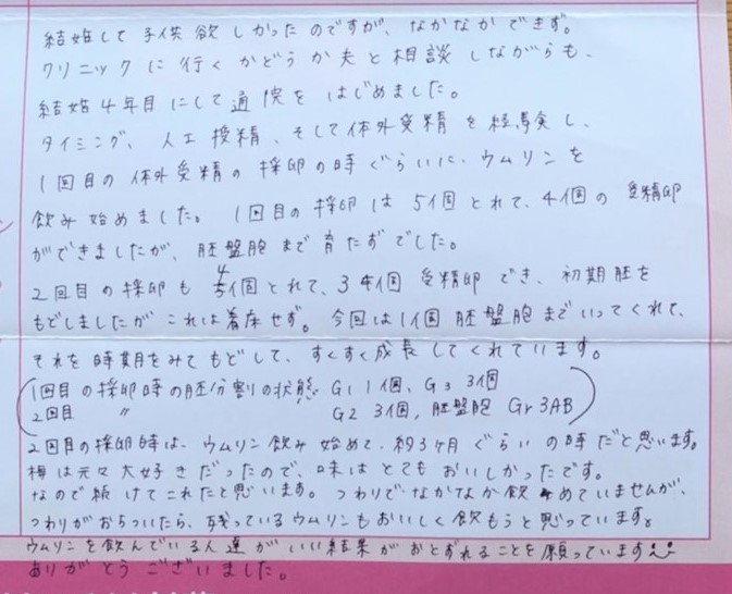 ウムリンを飲んでいる人達がいい結果がおとずれることを願っています。ありがとうございました。