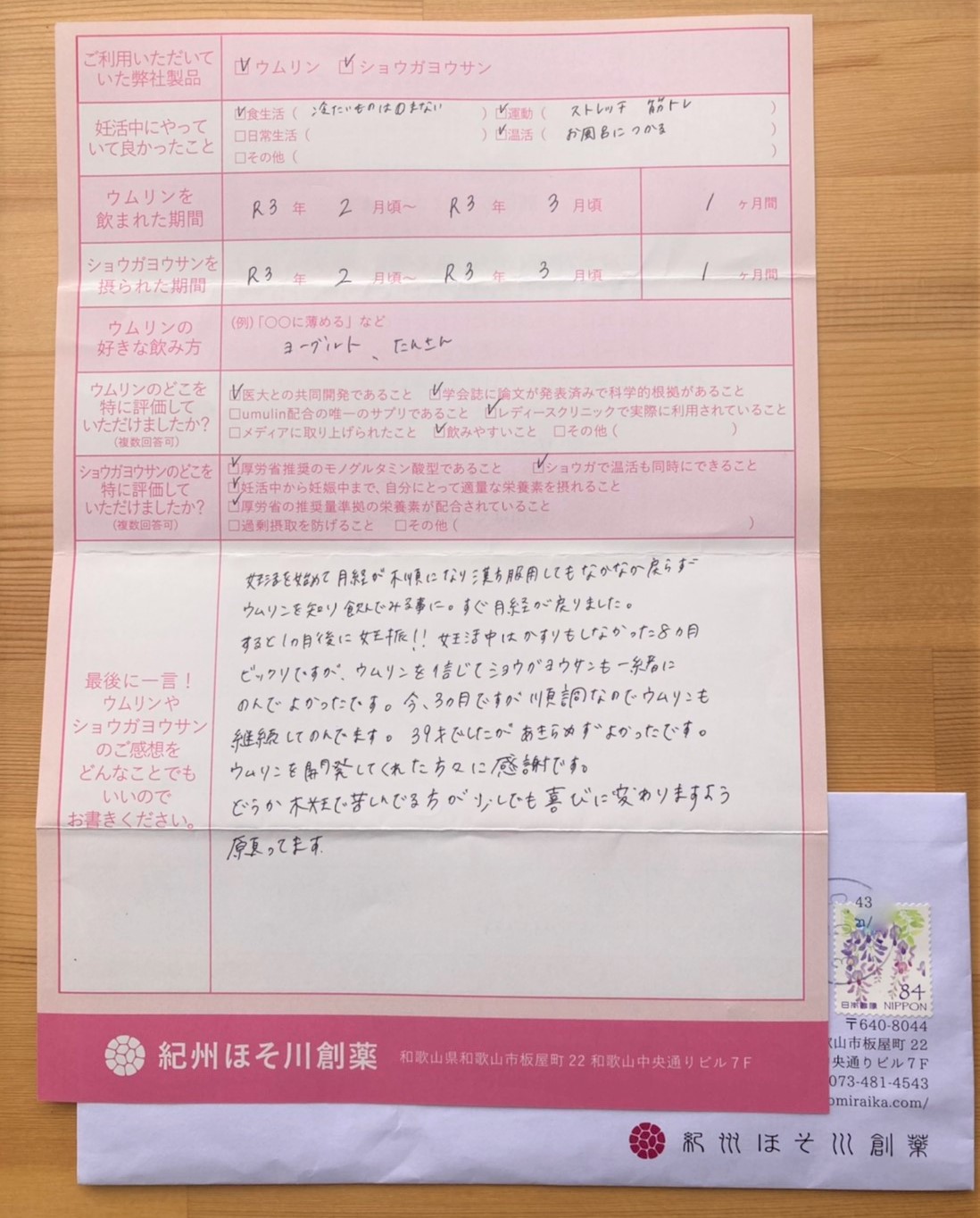 ウムリンを信じてショウガヨウサンも一緒にのんでよかったです。今3ヶ月ですが順調なのでウムリンも継続して飲んでます。39才でしたがあきらめずよかったです。