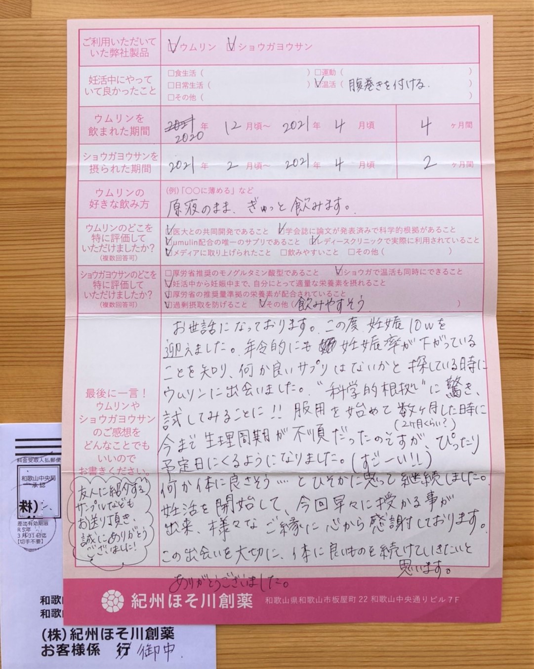 今回早々に授かる事が出来、様々なご縁に心から感謝しております。この出会いを大切に、体に良いものを続けていきたいと思います。ありがとうございました。友人に紹介するサンプルなどもお送り頂き、誠にありがとうございました!
