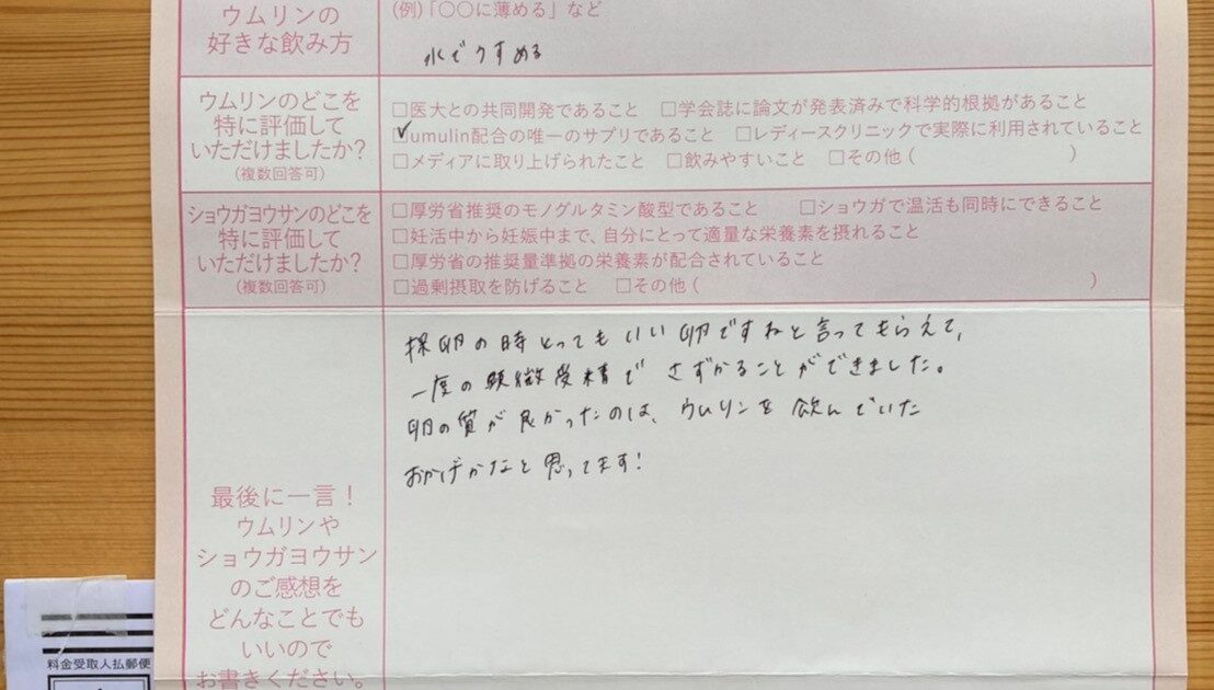 ウムリンを紹介してもらい、朝晩飲んでいました。味も美味しく、苦にならなかったです。 定期便に一緒に同封されているお手紙も見ていてほっこりしました。ありがとうございました。