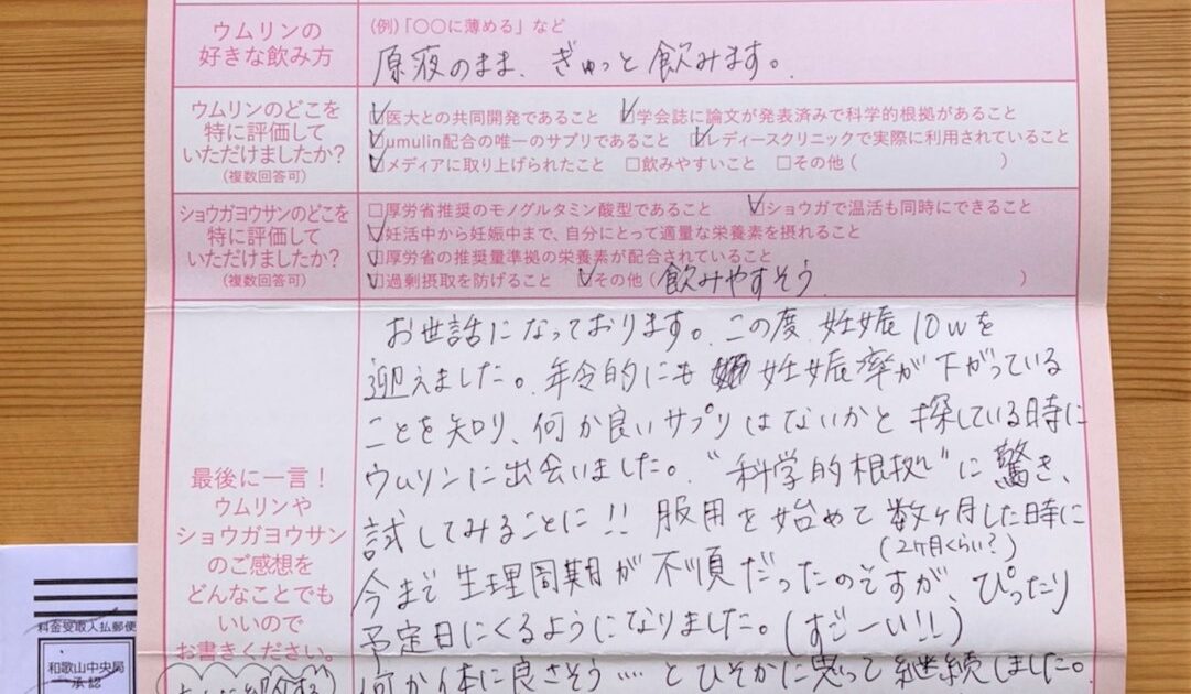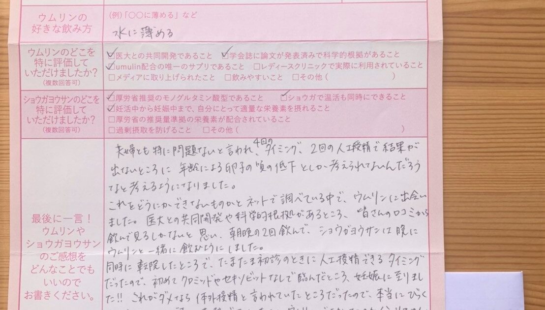 葉酸の吸収を良くするということもあり、妊娠が分かってからもしばらく飲んでいました。 無事心拍も確認でき幸せな気持ちになっています。 ウムリンに出会い続けてよかったです!ありがとうございました。