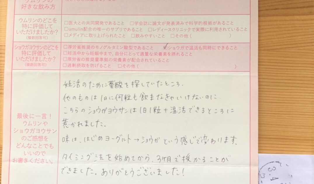 ウムリンを信じてショウガヨウサンも一緒にのんでよかったです。今3ヶ月ですが順調なのでウムリンも継続して飲んでます。39才でしたがあきらめずよかったです。 ウムリンを開発してくれた方々に感謝です。