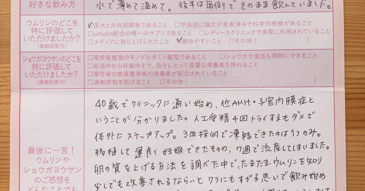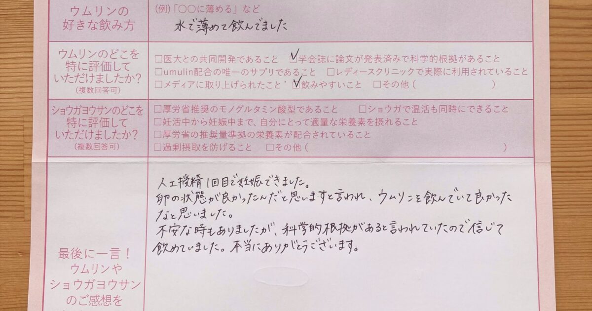 ウムリンを飲んでいて良かったなと思いました。 不安な時もありましたが、科学的根拠があると言われていたので信じて飲めていました。本当にありがとうございます。