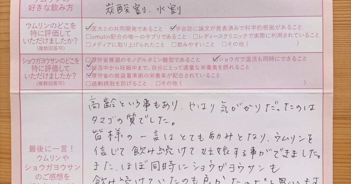 本当に嬉しかったです。 漢方、運動、サプリ、いろんな事をしてましたが、初めて、陽性でたので、ウムリンのおかげかなと思っています。ありがとうございました。