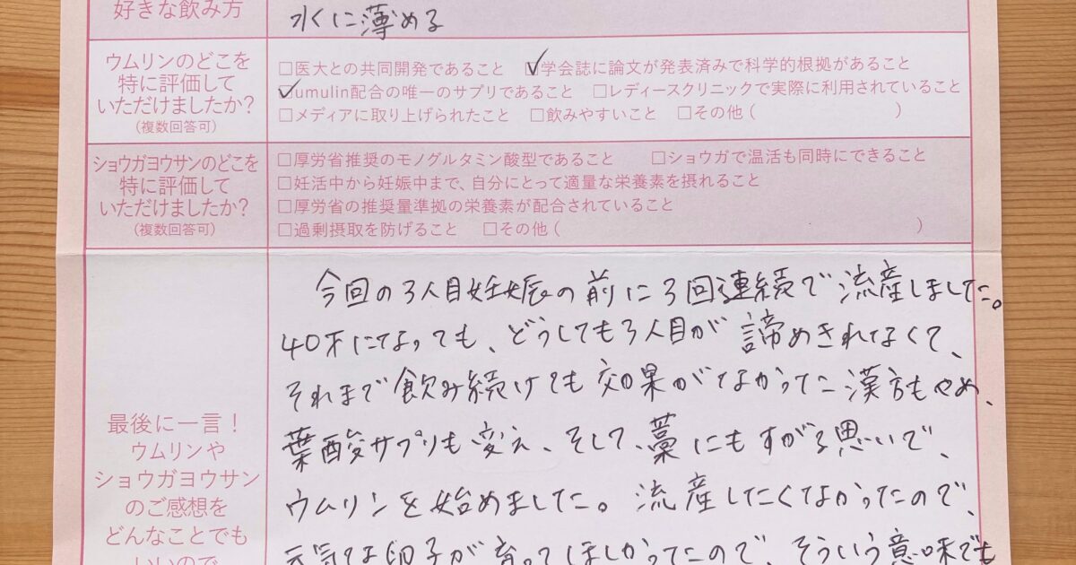 40才になっても、どうしても3人目が諦めきれなくて、それまで飲み続けても効果がなかった漢方もやめ、葉酸サプリも変え、そして、藁にもすがる思いで、ウムリンを始めました。ウムリンに期待していました。 やはりウムリンのおかげだ […]