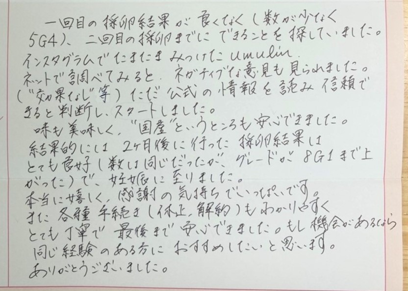 インスタグラムでたまたまみつけたumulin。ネットで調べてみると、ネガティブな意見も見られました。 (“効果なし”等)ただ公式の情報を読み信頼できると判断し、スタートしました。