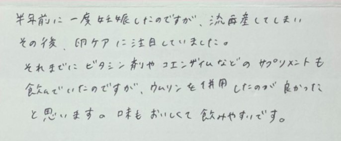 ビタミン剤やコエンザイムなどのサプリメントも飲んでいたのですが、ウムリンを併用したのが良かったと思います。味もおいしくて飲みやすいです。