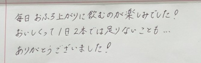 毎日おふろ上がりに飲むのが楽しみでした! おいしくって1日2本では足りないことも… ありがとうございました!