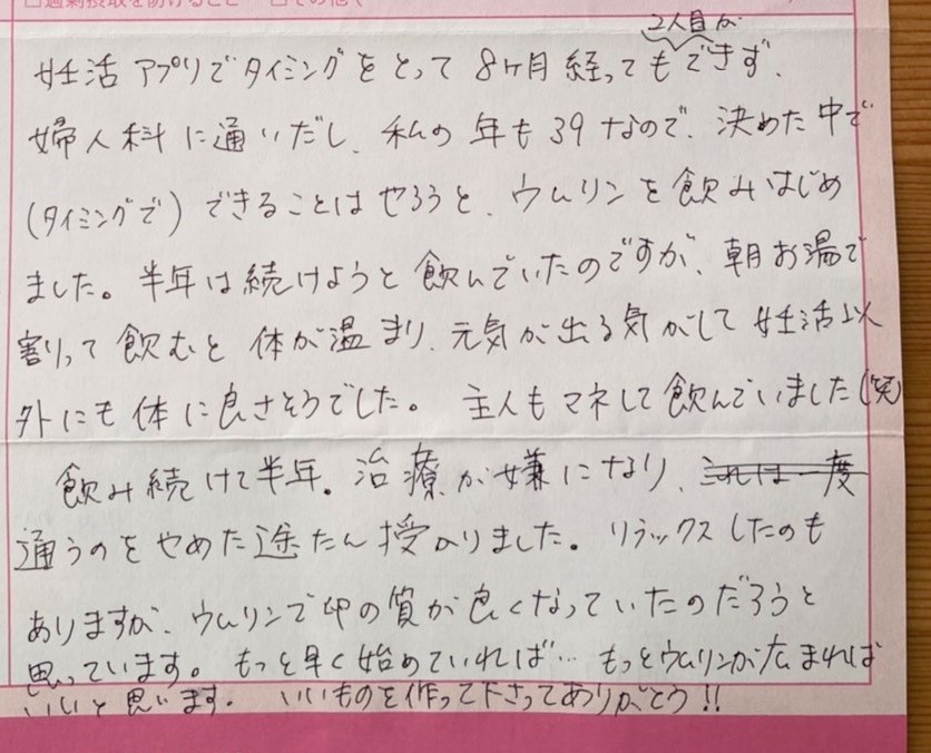 婦人科に通いだし、私の年も39なので、決めた中で(タイミングで)できることはやろうと、ウムリンを飲みはじめました。半年は続けようと飲んでいたのですが、朝お湯で割って飲むと体が温まり、元気が出る気がして体に良さそうでした。主人もマネして飲んでいました(笑)もっと早く始めていれば…もっとウムリンが広まればいいと思います。いいものを作って下さってありがとう!!