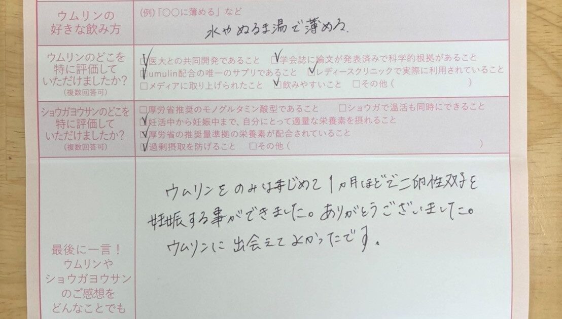 焦りを感じたときにたまたまインスタグラムでウムリンを見かけ、わらをもすがる思いで注文しました。 信じて飲み続けて良かったです。ありがとうございました。
