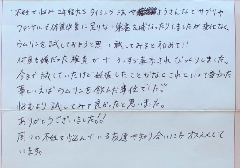 ようさんなどサプリやファンケルで体質改善に足りない栄養を補なったりしましたが変化なくウムリンを試してみようと思い試してみると初めて!!何度も嫌だった検査が+うっすら表示されびっくりしました。悩むより試してみて良かったと思いました。ありがとうございました!!