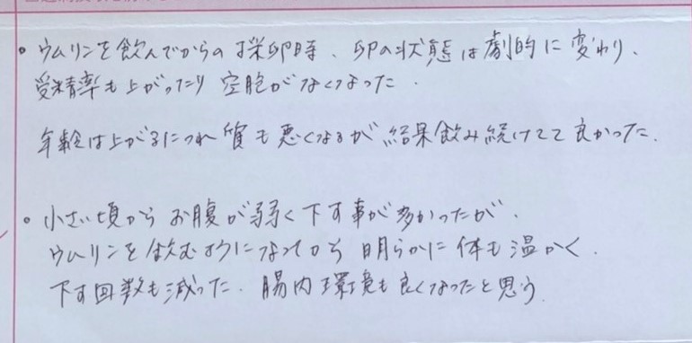 小さい頃からお腹が弱く下す事が多かったが、ウムリンを飲むようになってから明らかに体も温かく、下す回数も減った。腸内環境も良くなったと思う。